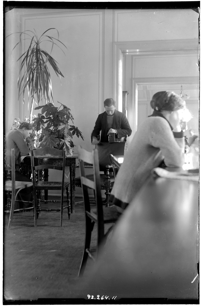 Hålahults sanatorium, interiör, två kvinnor, man med kamera, fotograferande
