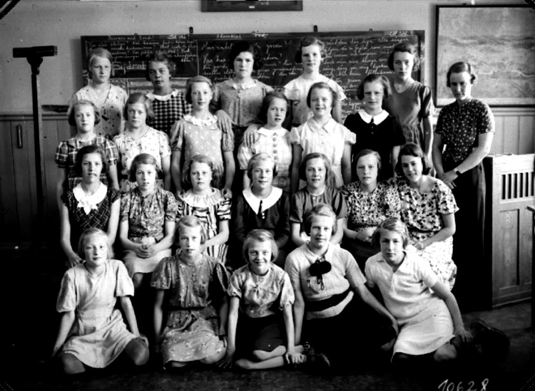 Nikolaiskolan, klassrumsinteriör, 23 flickor med lärarinna fröken Valborg Munthe.