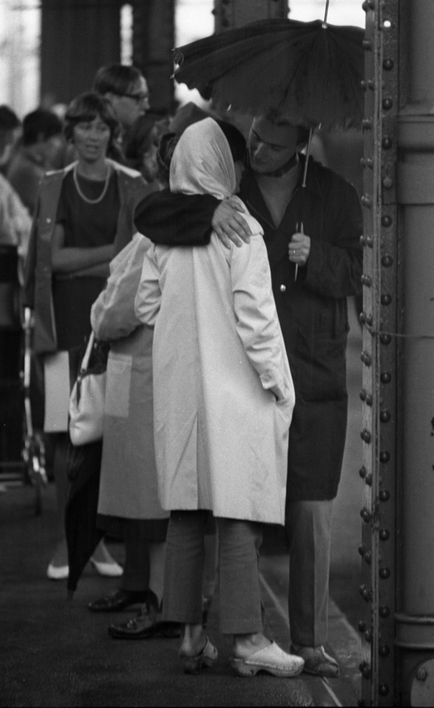 Ett ungt förälskat par står tillsammans och omfamnar varandra på Örebro järnvägsstation. Kvinnan är klädd i sjalett som är knuten över håret, kappa, byxor och träskor. Mannen håller ett paraply över sitt och kvinnans huvud och är klädd i rock, tröja, byxor och sandaler.