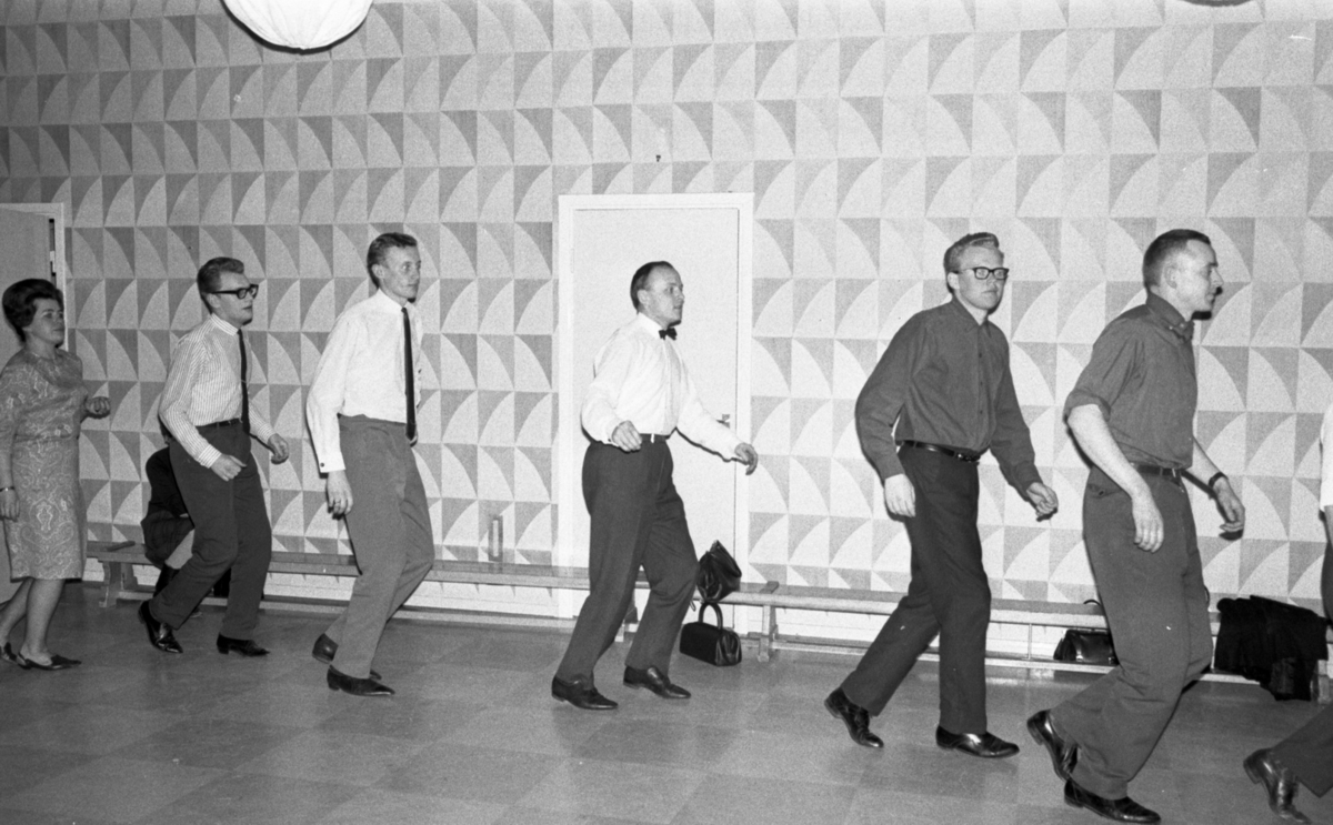 Fem personer dansar i ring och håller varandra i händerna. Ytterligare personer dansar med dem men syns ej på bilden. I bakgrunden till höger syns fönster med gardiner. I mitten i bakgrunden syns en dörr samt längre till vänster ribbstolar med gymnastikmattor. På golvet syns det ett mönster av kontrasterande ljusare och mörkare kvadratiska rutor.