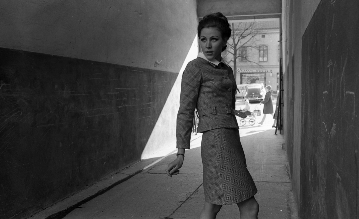 Bakom henne ser man Stortorget där bilar står parkerade, och en kvinna med barnvagn.