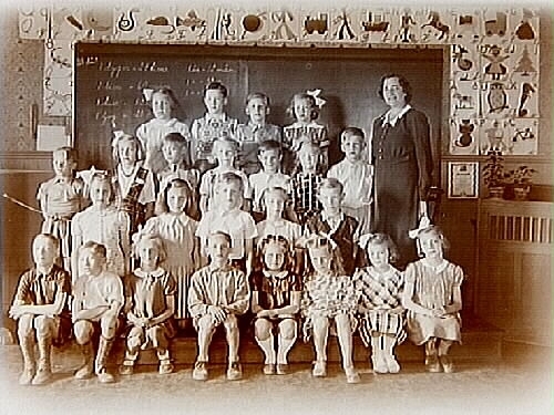 Sofielundsskolan, klassrumsinteriör, 24 skolbarn och lärarinna fröken Anna Thyresson, sal 4, klass 2.