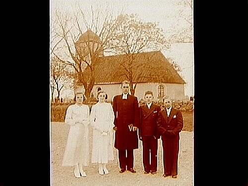 Konfirmander, två flickor, två pojkar och pastor Folke Tyrbjörn.