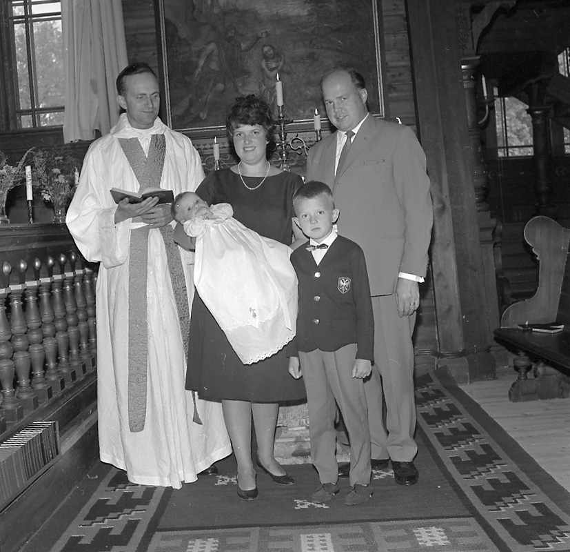 Interiör av Ljusnarsbergs kyrka, dop, familjegrupp fyra personer och en präst.