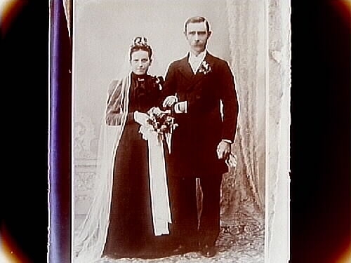 Brudpar, bruden har vit slöja, brudkrona och svart klänning. Brudbuketten har långa, breda, vita band.