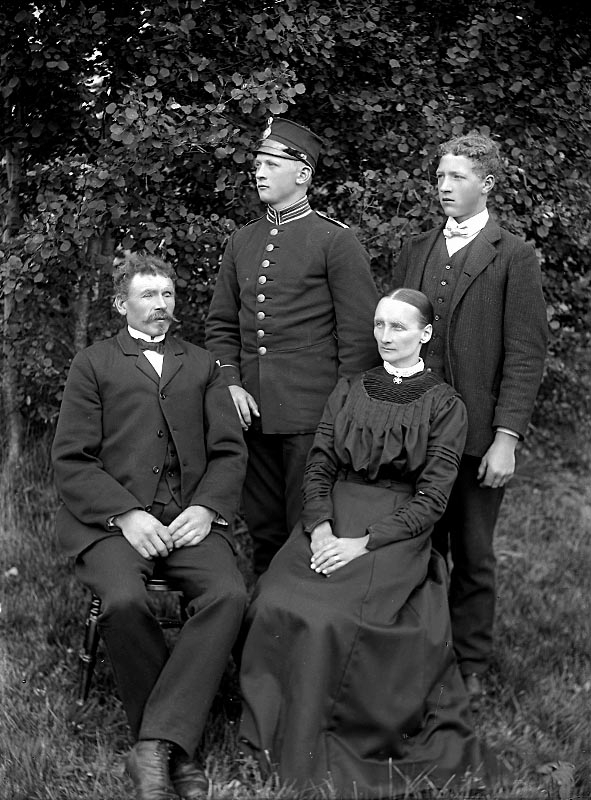 Familjegrupp fyra personer i trädgården.