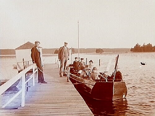Båten "Bylgia" vid en brygga vid Tunnbo. Åtta personer och en hund.