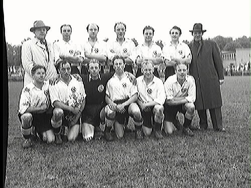 Glada och lättade efter utståndna prövningar poserar de nya allsvenskarna för fotograf Klingberg: Överst: Gösta Pettersson, Gösta Lind, H Wolfbrandt, L Andersson, Å Engvall, B Remnegård, E Carnborg (medicinman). Under: O Sääw, S Dahl, B Carlsson, A Hedberg, V Pettersson, E Blomkvist.