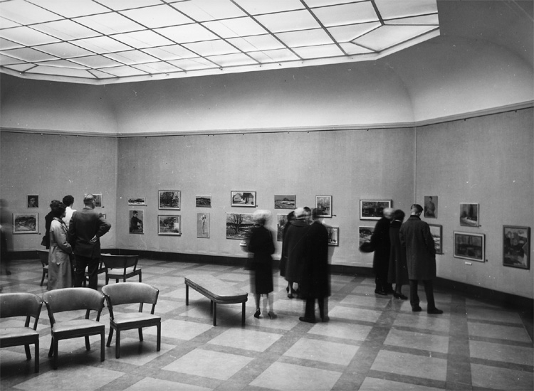 Inga Bergs utställning på Konserthuset, interiör av utställningssalen med besökare.