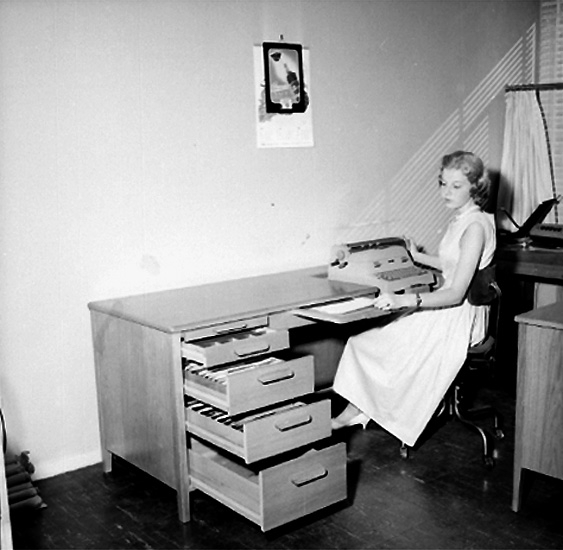Kontorsinteriör, en kvinna vid skrivmaskinen.