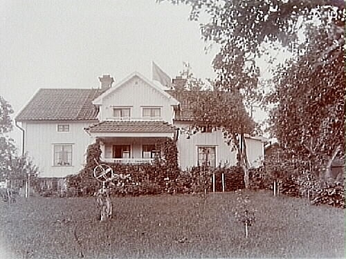 En och en halvvånings bostadshus med frontespis, förstuga, veranda och balkong. Baksidan.
