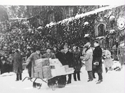 Här rullar man ut kex-presenterna. ÖSK:arna Gutten Johansson och Åke Engvall syns i mitten. Pressfotografen är Rolle Eneflod(ett par år Torsten Tegnérs Idrottsbladets fotograf). Han kom tillbaka till Örebro och blev polisfotograf.