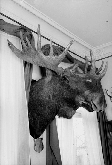 Rumsinteriör, älghuvud på väggen.