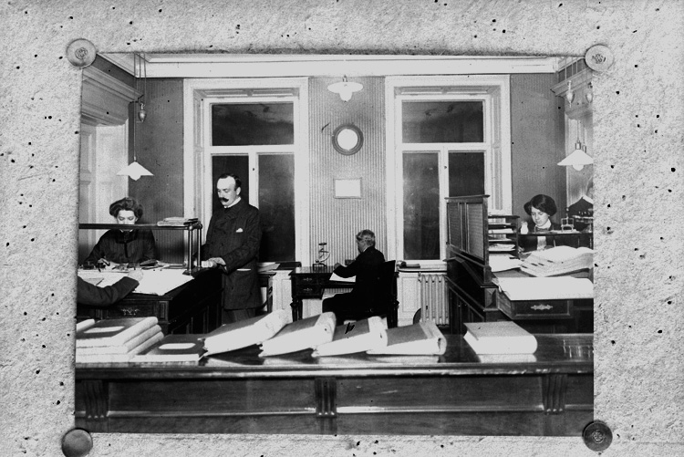 Skofabrik, kontorsinteriör, 4 personer.