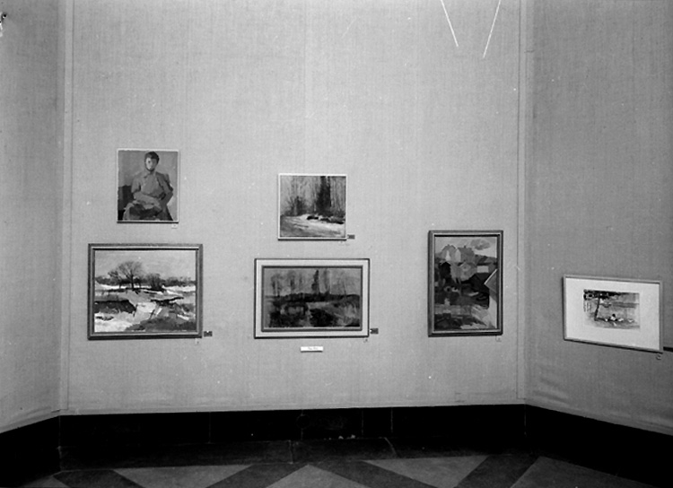 Titel: Inga Bergs utställning på Konserthuset, interiör av utställningssalen, tavlor.