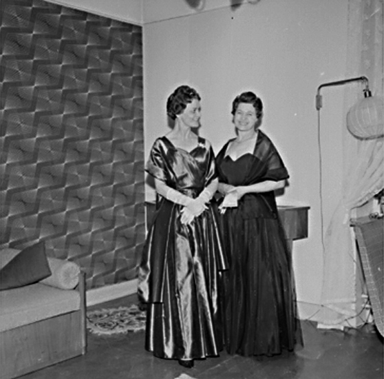 Rumsinteriör, två kvinnor i högtidsdräkt.