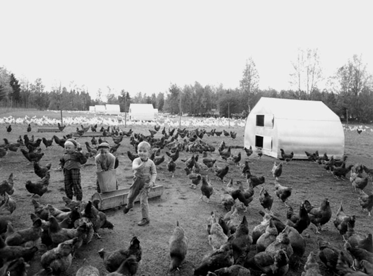 Stubbetorps Kontrollhönseri, byggnader, höns, tre barn.