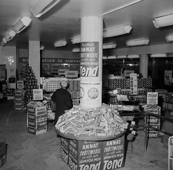 Konsum, affärsinteriör, tvättmedel Tend, en man.