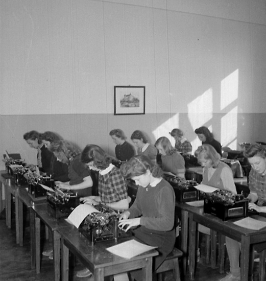Klassrumsinteriör, flickgrupp, maskinskrivning.