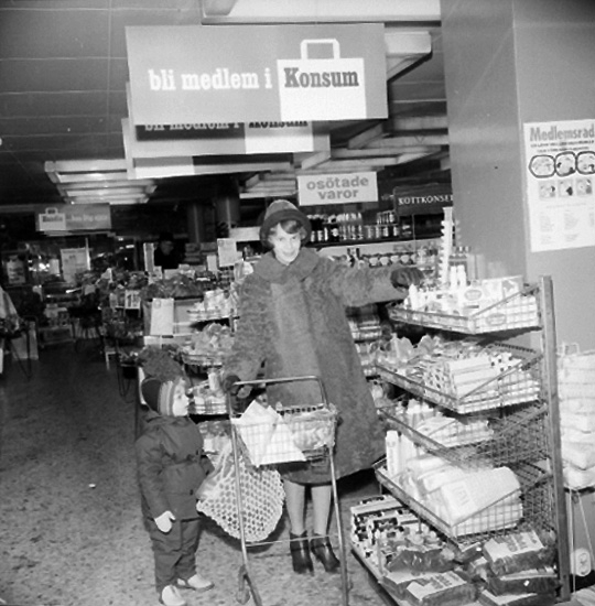 Konsum, affärsinteriör, en kvinna och en liten flicka.