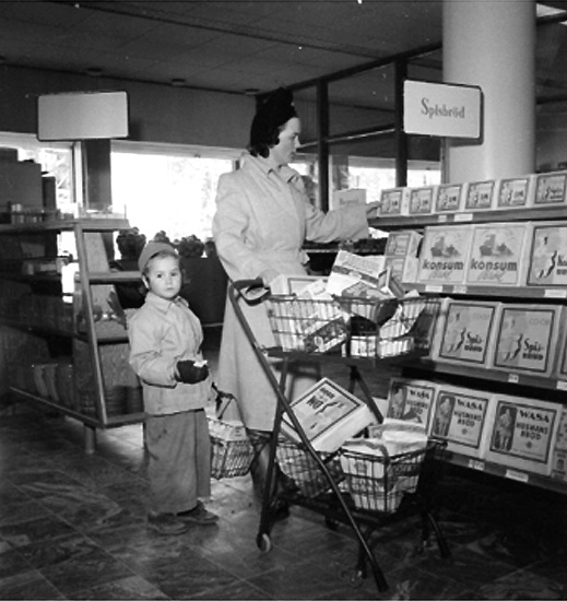 Konsum snabbköp, affärsinteriör, en kvinna och ett barn.