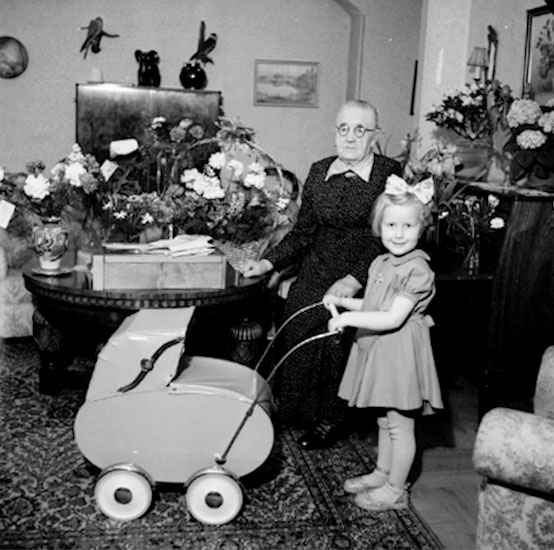Rumsinteriör, en äldre kvinna och en liten flicka.