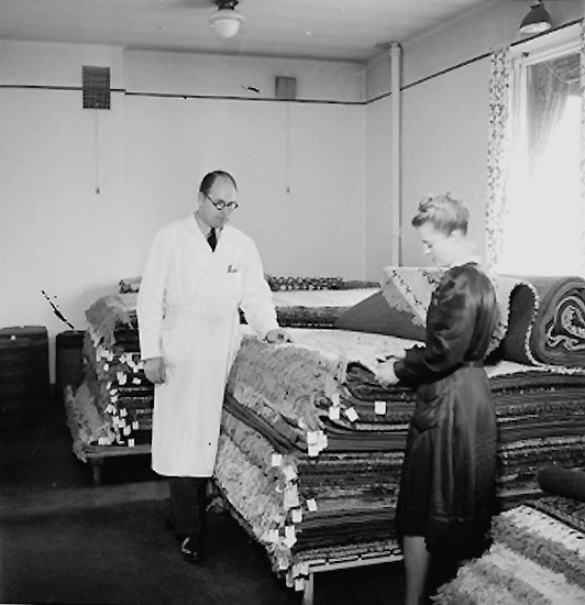 Konsum Möbler, affärsinteriör, mattor, två personer.