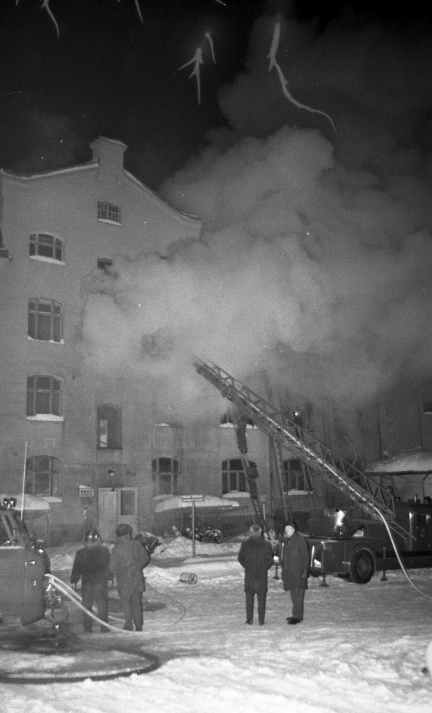 En byggnad brinner och rök väller ut ur den. I förgrunden syns fyra män som står på den snöklädda marken och betraktar det hela. En av dem är brandman. Han står invid brandslangar som används för att spruta vatten på byggnaden. Mot byggnadens husfasad står en brandman på en stege.