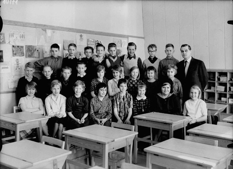 Vasaskolan, klassrumsinteriör, 25 skolbarn med lärare Per-Olof Engström.