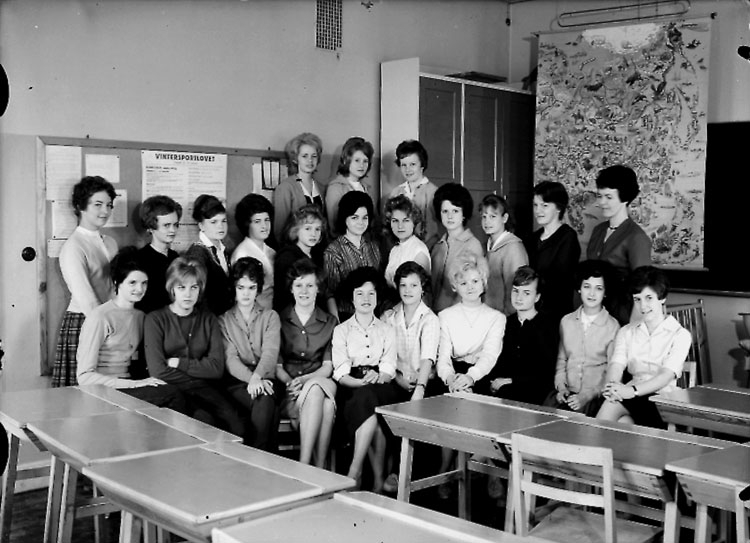 Klassrumsinteriör, 23 flickor med lärarinna.