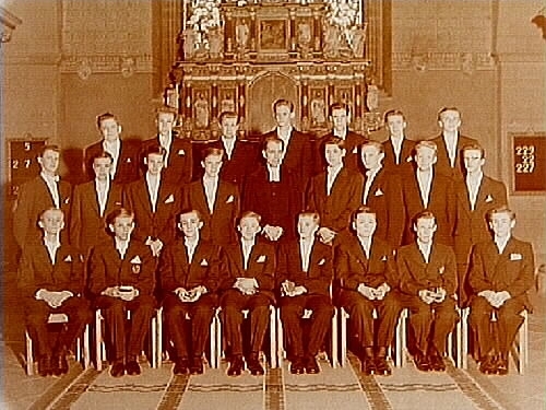 Konfirmander, 23 pojkar och pastor Ragnar Ekström, pojkar från Karolinska Läroverket.