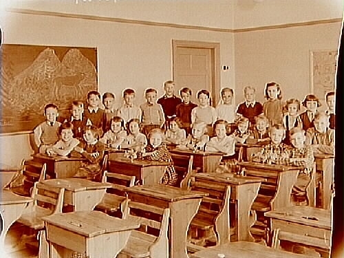 Klassrumsinteriör, elever med lärare.
