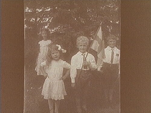 Fyra barn med en flagga.