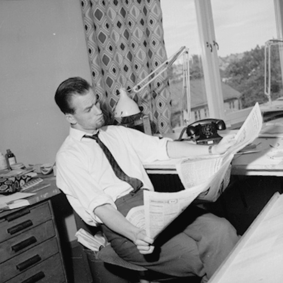 Kontorsinteriör, en man vid skrivbordet.