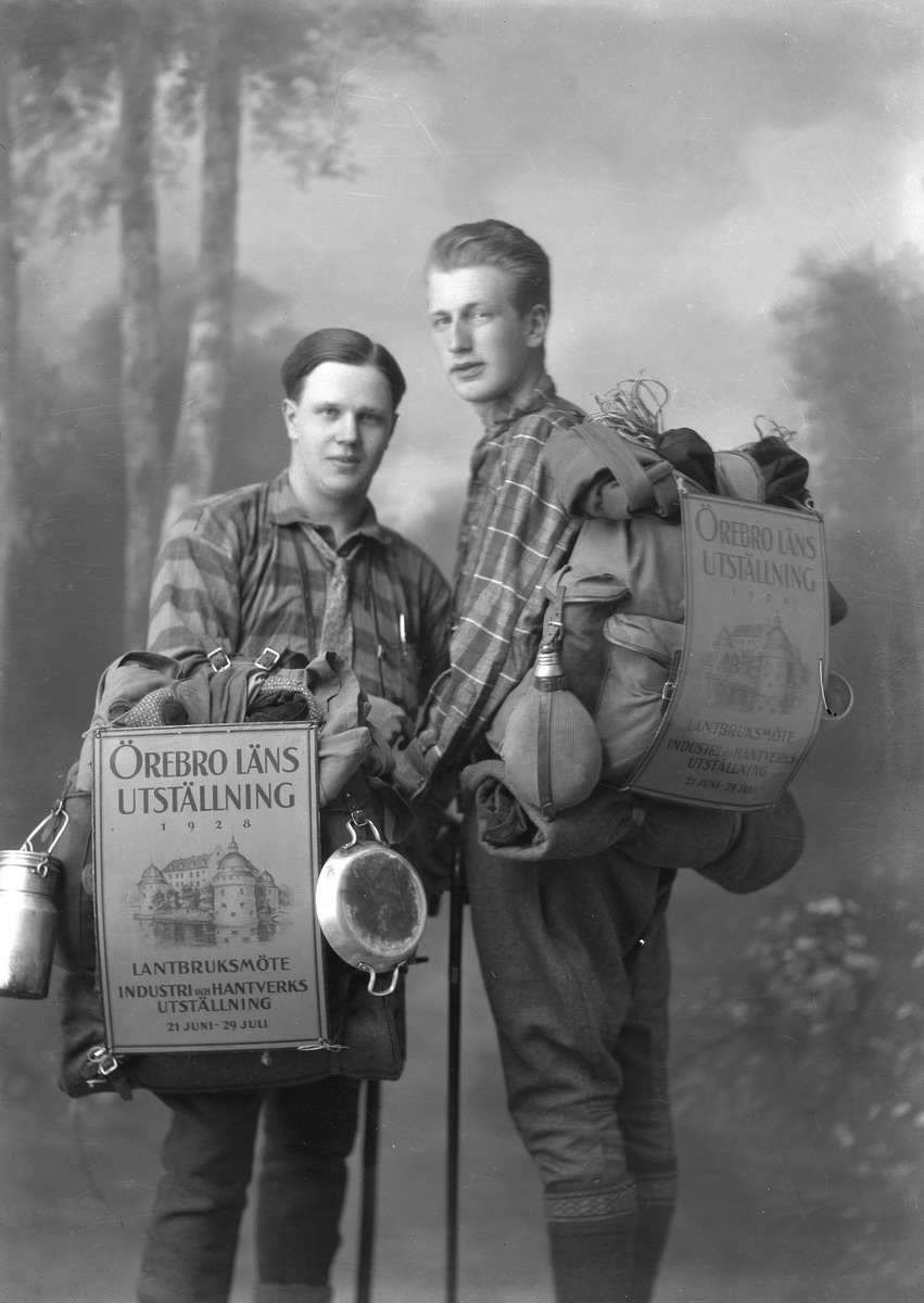 Två unga män med affischer på ryggen: "Örebro läns utställning 1928. Lantbruksmöte, Industri och hanverksutställning 21 juni - 29 juli".
