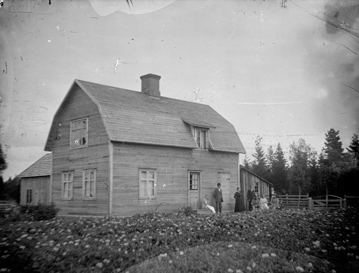 Bostadshus, grupp framför huset.
