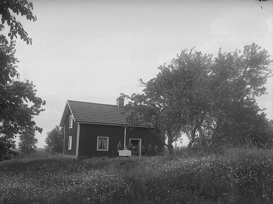 Stora Svarthyttan, torpstuga, familjegrupp framför stugan.