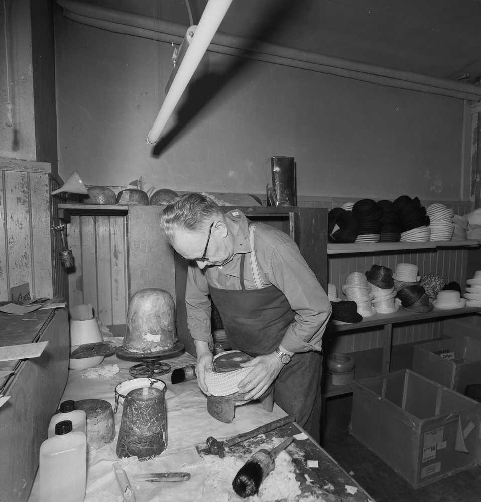 Lindbergs Strå- och Filth. Hattillverkning. 203/67 Hatten torkas och formas därefter på träform. Här först kullen därefter brättet.