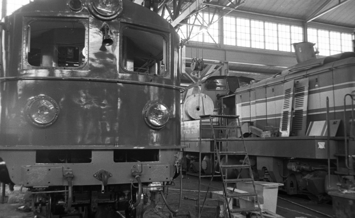 Ett lok står inne på CV. En stege syns till höger. Ytterligare ett lok ses i bakgrunden till höger.