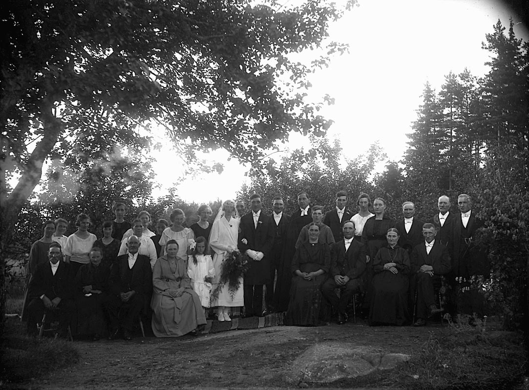 Gruppbild, bröllop, brudpar och bröllopsgäster.