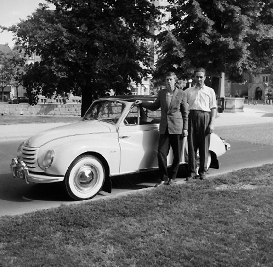 Två män vid bilen.