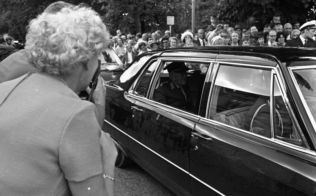 Kung Gustav VI Adolf sitter i baksätet på en bil utanför Örebro Läns Museum klädd i militäruniform. Han ler. I framsätet sitter en annan man i militäruniform. En äldre dam i ljus klänning och med pärlhalsband om halsen fotograferar honom. Ytterligare åskådare betraktar kungen.