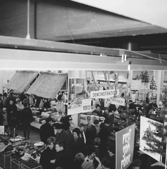 Titel: Konsum Domus, affärsinteriör, kunder och personal, demonstration av Pyrex-produkter.