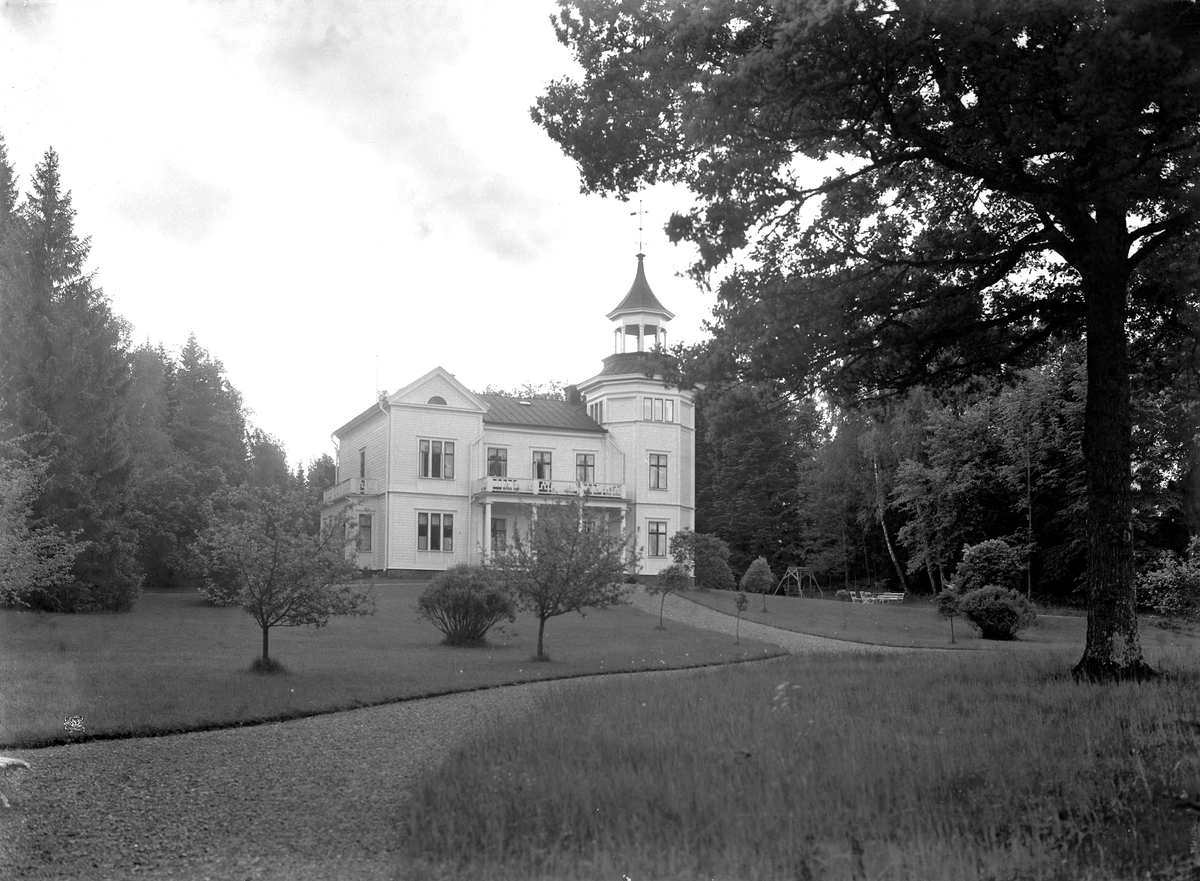Tvåvånings villa med ett torn, burspråk, balkonger och verandor.