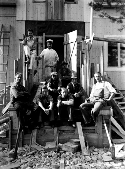 Husbygge, 9 byggnadsarbetare på trappan till huset.