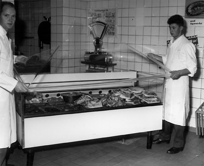 Konsum, affärsinteriör, charkuteriavdelningen, två män vid kyldisken.