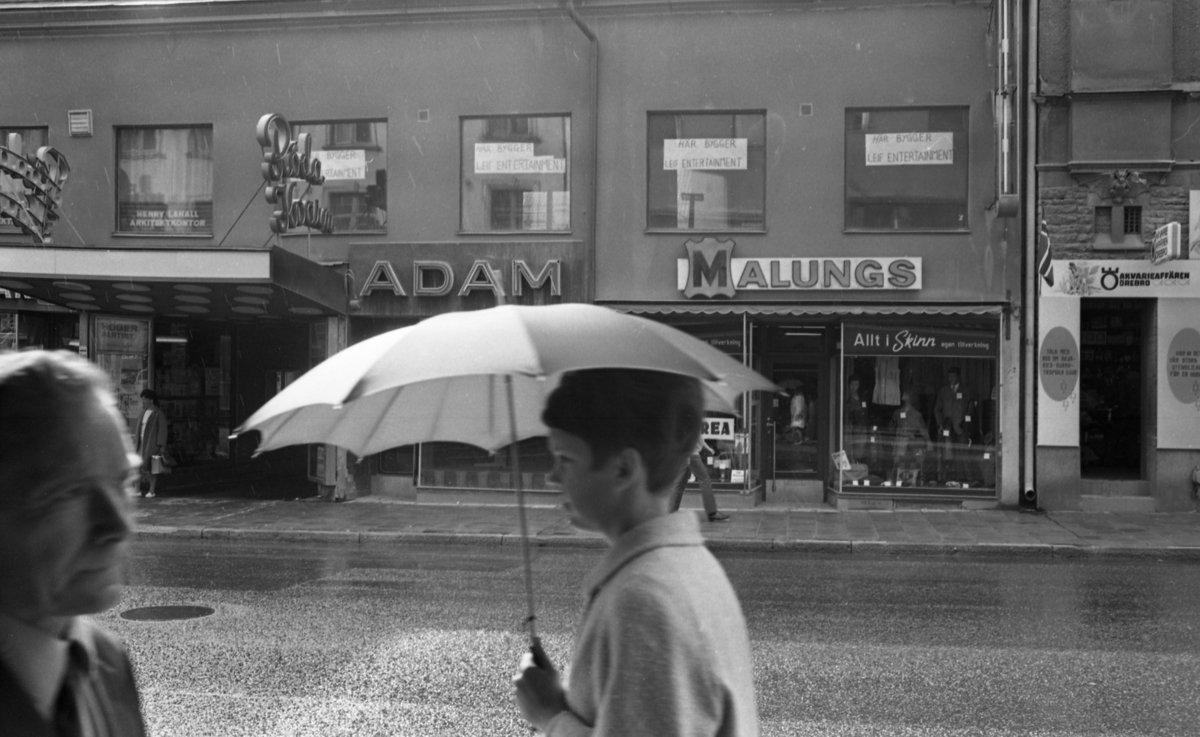Titel: Rubrik till negativbilderna: Morötter. 27 juli 1968. På bilden biografen Röda Kvarn, Storgatan 21, affärsbyggnader, Adam, Malungs.