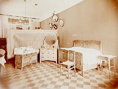 Sängkammarmöbel, två sängar, två nattduksbord, en spegelbyrå och en lavoar.