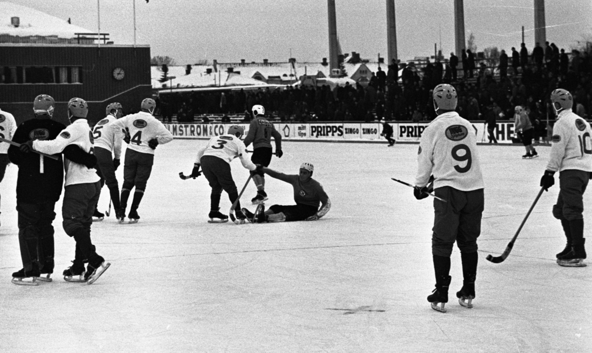På bilden syns bandyspelare i isrinken. En spelare har ramlat och får hjälp av en annan spelare att ta sig upp igen. Reklamskyltar som 'Pripps', 'Zingo' m.m. syns i bakgrunden. Publik står på läktaren i bakgrunden.