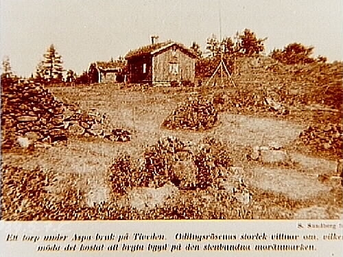 Naturbild. Ett torp under Aspa bruk på Tiveden. Ödlingsrösenas storlek vittnar om vilken möda det kostat att bryta byggd på den stenbundna moränmarken.